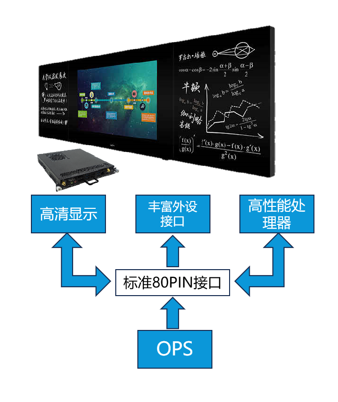 教育大屏/黑板设备主要围绕提升教学效果和便利教师教学设计,OPS电脑在其中提供了高清显示功能,更加全面的接口功能,高清摄像头与麦克风处理功能,高性能处理器性能等功能。这些功能增强了课堂教学的生动性。不仅提高了教学效果,也促进了教育公平,为教育现代化建设做出了贡献。